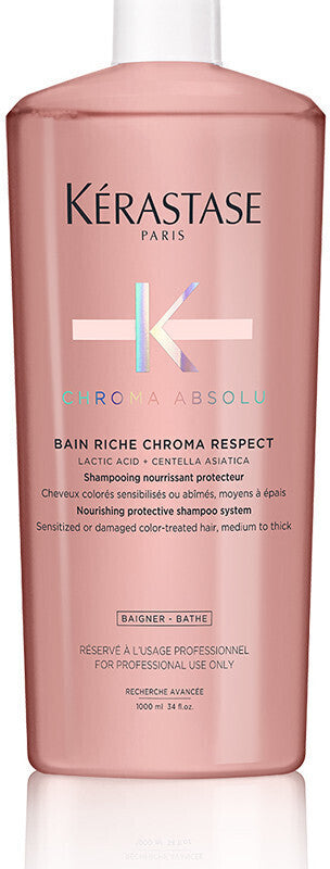 Bain Chroma Respect is a gentle, hydrating shampoo for sensitized or damaged colour treated, fine to medium hair. This sulphate-free shampoo gently cleanses and hydrates hair while respecting the fibre to prevent colour fadage without weighing hair down. Infused with Centella Asiatica and three Restoring Acids: Amino Acid, Lactic Acid and Tartaric Acid, the Chroma Absolu range heals hair from the inside out with +95% nourishment*, +92% strength** and +92% colour preservation for up to 6 weeks*.